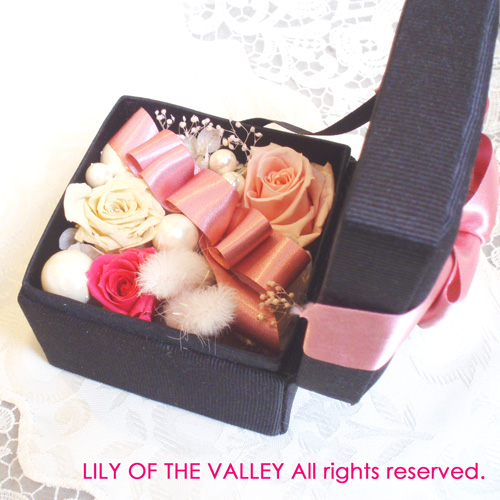 旅立つ方への贈り物に、ジュエリーボックススタイルのアレンジはいかがですか? 高級感のある布張りのボックスの中に、プリザーブドローズやカスミソウ、そして沢山のパールをアレンジ。モダンでおしゃれなボックスアレンジは、持ち運びが便利なので、遠方へ行かれる方へのプレゼントにもおすすめです!