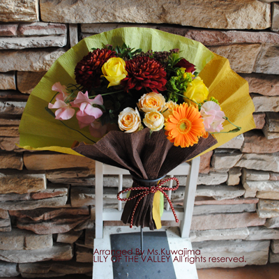 落ち葉を敷き詰めた秋にピッタリのブーケを制作します